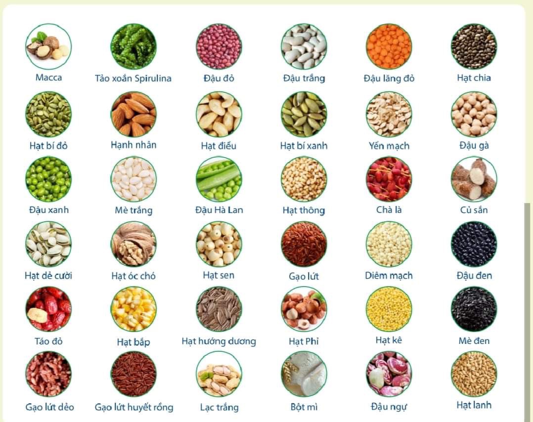 Hỗn hợp các loại bột: Óc chó, Macca, Hạnh nhân, Tảo xoắn Spirulina, Hạt dẻ cười, Hạt điều, Hạt bí đỏ, Yến mạch, Diêm mạch, Hạt lanh, Hạt kê, Đậu đỏ, Đậu trắng, Đậu gà, Đậu lăng đỏ, Hạt chia, Đậu đen, Đậu xanh, Đậu Hà Lan, Hạt bắp, Mè đen, Gạo lứt, Hạt sen, Chà là, Mè trắng, Táo đỏ, Hướng dương, Hạt thông, Hạt phỉ, Gạo lứt dẻo, Gạo lứt huyết rồng, Hạt bí xanh, Lạc trắng, Củ sắn, Bột mì, Đậu ngự, Isomalt, Canxi hữu cơ, Chất xơ hòa tan (FOS/Inulin).